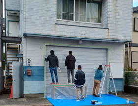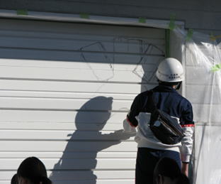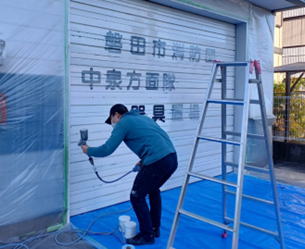 シャッターアート準備作業写真 <清掃・錆取り・下塗り 2022年11月27日・12月3日> ![]() 清掃・下塗り前 養生作業 ![]() さび取り、はがれ削り 清掃 ![]() スプレー下塗り はけ下塗り